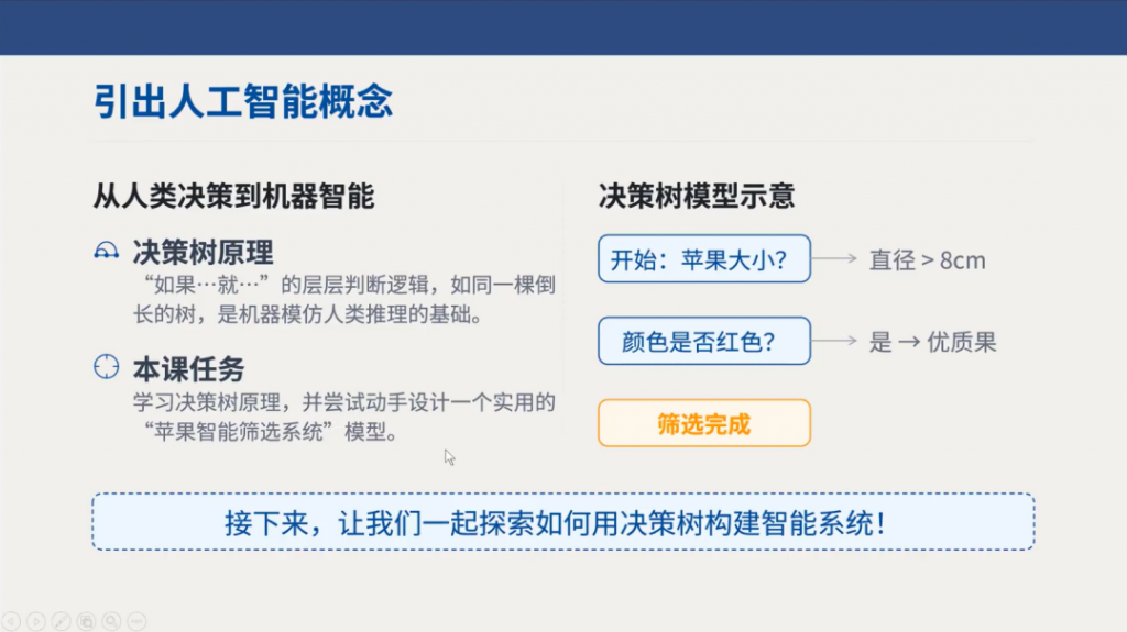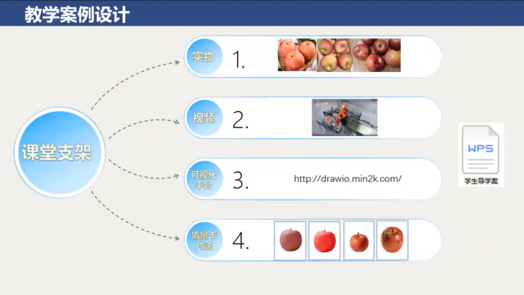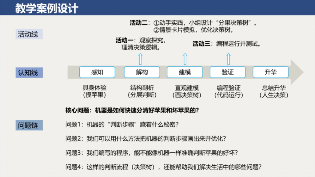 在案例设计分享环节,淮安市文津小学的郭利娟老师展示了小学阶段的“机器分拣苹果”教学案例。郭老师通过实物观察、卡片模拟、图形化编程体验等系列活动,引导学生在动手做中感知“条件判断-规则推理”的完整逻辑,生动诠释了小学阶段在体验中建立智能意识的目标。
