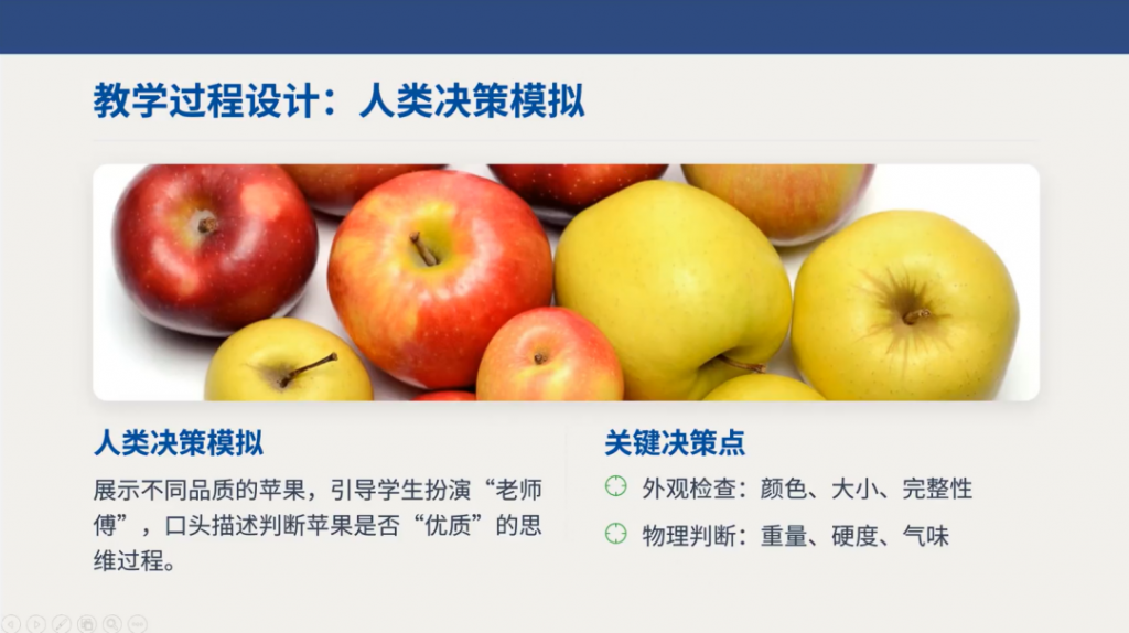 句容市崇明中学的邹华老师分享了初中阶段的“智慧果园苹果筛选系统设计”案例。该案例在小学体验基础上,引导学生向技术逻辑理解迈进,聚焦特征选择、阈值设定、模型验证与优化,并初步融入伦理思辨,体现了初中阶段的素养与目标。