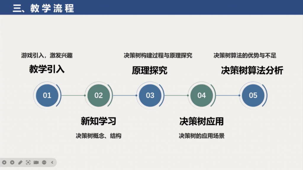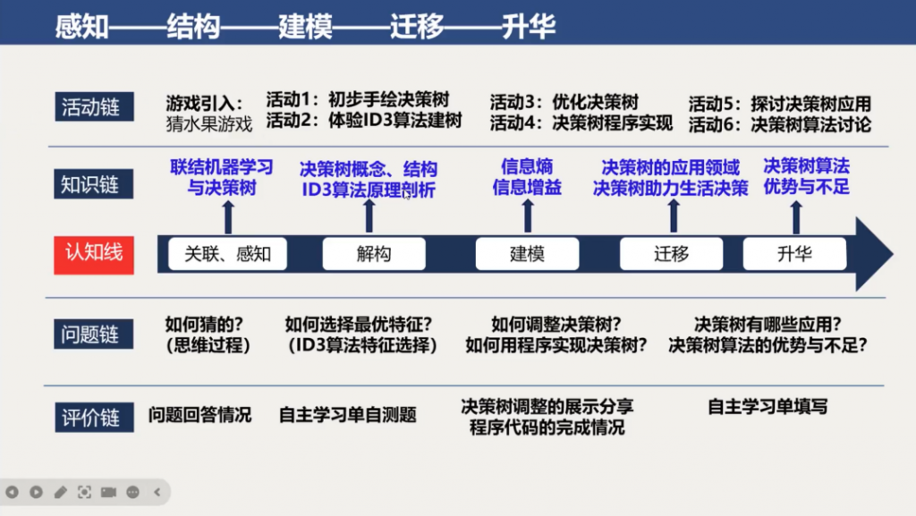 团队负责人、南京市秦淮中学的刘付燕老师首先概述了高中阶段决策树教学的整体设计逻辑,强调以“知识链、问题链、活动链、评价链”四链融合的方式落实教学目标,分享了高中”决策树算法”从零基础通识课出发的教学设计,通过”猜水果”游戏导入、新知学习,决策树ID3算法原理探究、Python编程实践等层层递进的活动,引导学生理解机器学习的数据思维与分而治之算法思想。