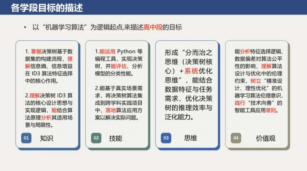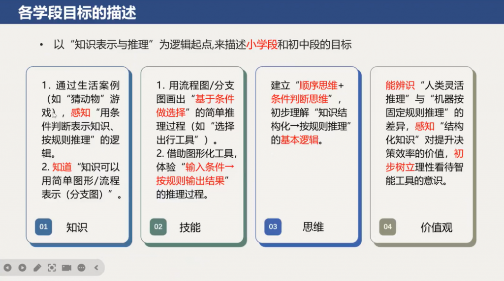 本次主备团队负责人、南京市秦淮中学刘付燕老师率领团队进行了系统的教学展示。南京市天印高级中学张宝峰老师进行了理论梳理与学段衔接分析,系统对比了《中小学人工智能通识教育指南》与多省市课程纲要,创造性地提出了以“知识表示与推理”作为小初学段核心抓手,以“机器学习算法”作为高中学段实施逻辑起点,为各学段目标的确立提供了扎实依据。