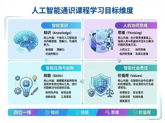 在前期实践中,我们已初步确立人工智能通识课程的四大学习目标维度: