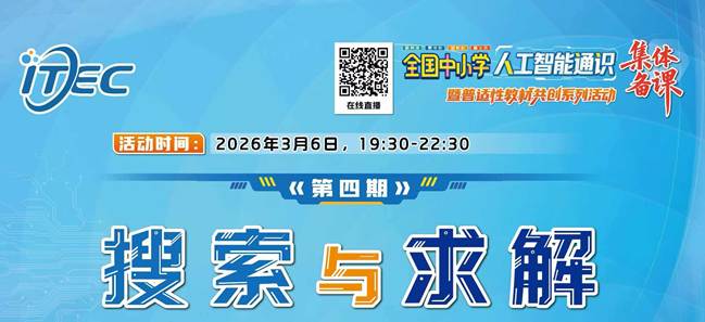 2026年3月6日晚,全国中小学人工智能通识集体备课暨普适性教材共创系列活动第四期——“探索与求解”线上专题备课活动成功举办。本次活动由中国教育学会中小学信息技术教育专业委员会主办,巫雪琴、毛文意等多个名师工作室联合承办,全国各参与省市名师工作室协办,旨在凝聚全国名师智慧,共同破解人工智能通识教育落地难题,推动课程体系化建设与教师专业发展。